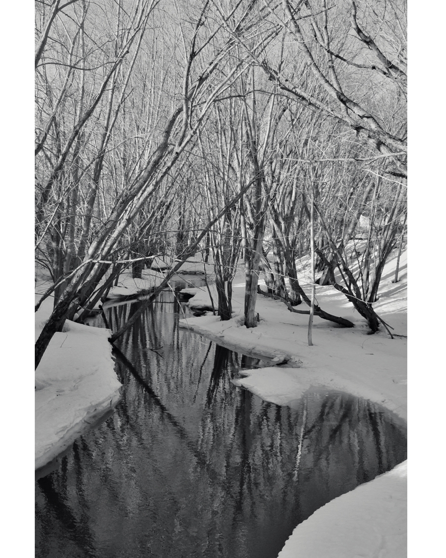 En smal vinterbäck ringlar sig genom snötäckt mark och täta och nakna träd i ett stilla svartvitt landskap. Motivet förmedlar närvaro, tystnad och naturens råa enkelhet. En tidlös väggbild som skapar djup och lugn i rummet. Observera: Bildens beskärning kan variera något på storleken 50x50 jämfört med andra format.149,00 kr